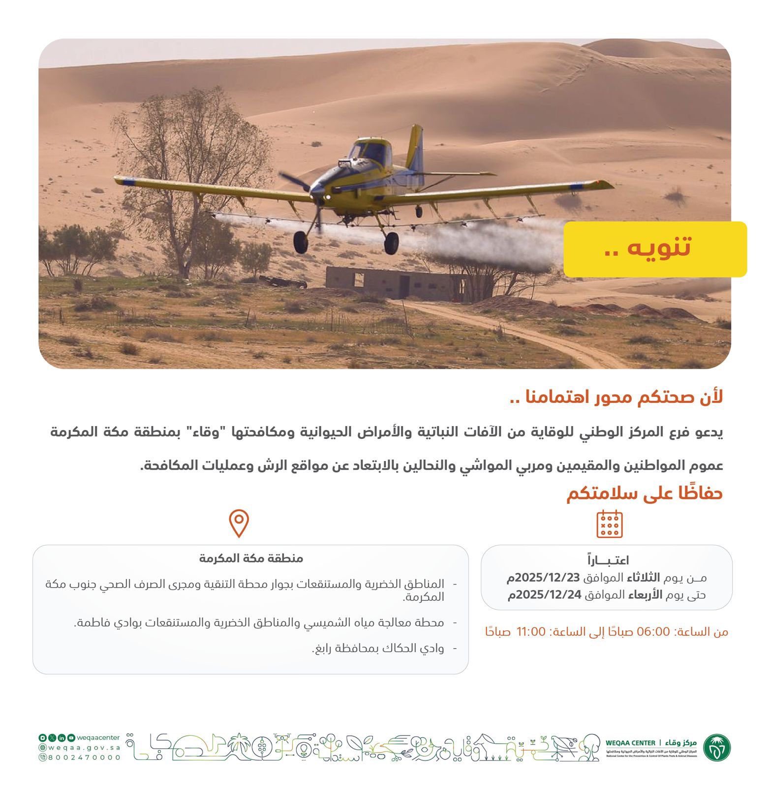 دعا فرع المركز الوطني للوقاية من الآفات النباتية والأمراض الحيوانية ومكافحتها “وقاء” بمنطقة مكة المكرمة، عموم المواطنين والمقيمين والمزارعين ومربي الماشية والنحالين، إلى أخذ الحيطة والابتعاد عن مواقع الرش الجوي وعمليات المكافحة، حفاظاً على سلامتهم.