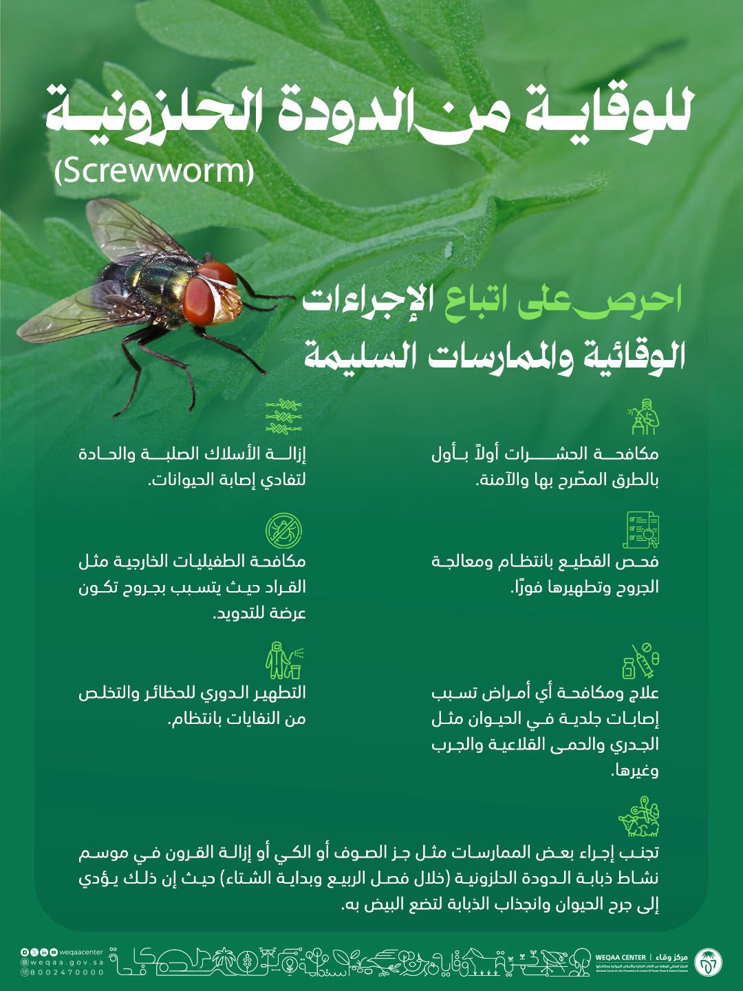 أوضح المركز الوطني للوقاية من الآفات النباتية والأمراض الحيوانية ومكافحتها “وقاء” عن إجراءات وقائية لحماية الثروة الحيوانية من الدودة الحلزونية، آفة خطيرة تنشط خلال فصل الربيع وبداية الصيف وتتسبب بجروح مؤلمة وعدوى بكتيرية تؤثر على صحة وإنتاجية الحيوان.