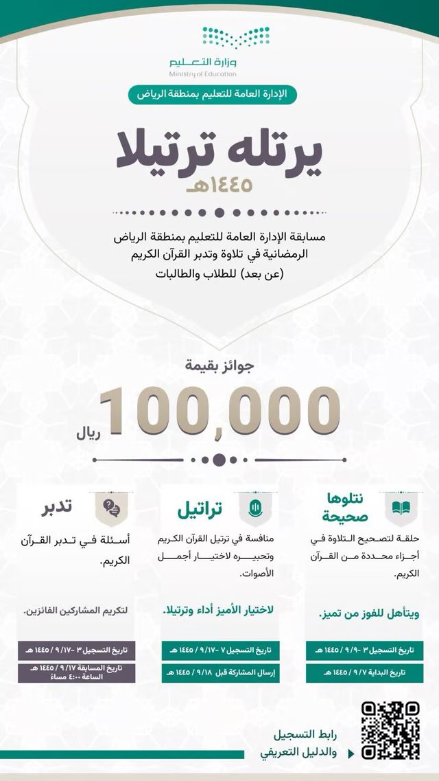 بجوائز تصل قيمتها إلى 100 ألف ريال .. #تعليم_الرياض يطلق المسابقة الرمضانية ” يُرَتِّلهُ تَرْتِيْلاً “