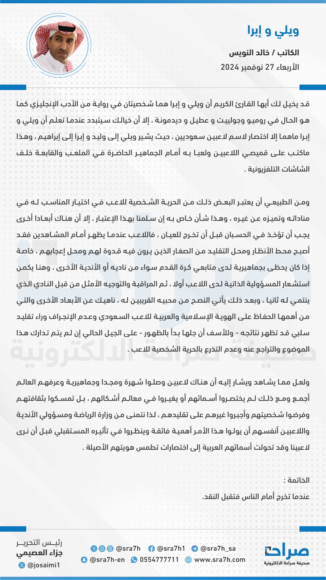 قد يخيل لك أيها القارئ الكريم أن ويلي و إبرا هما شخصيتان في رواية من الأدب الإنجليزي كما هو الحال في روميو وجولييت و عطيل و ديدمونة ، إلا أن خيالك سيتبدد عندما تعلم أن ويلي و إبرا ماهما إلا اختصار لاسم لاعبين سعوديين ، حيث يشير ويلي إلى وليد و إبرا إلى إبراهيم ، وهذا ماكتب على قميصي اللاعبين ولعبا به أمام الجماهير الحاضرة في الملعب والقابعة خلف الشاشات التلفزيونية .