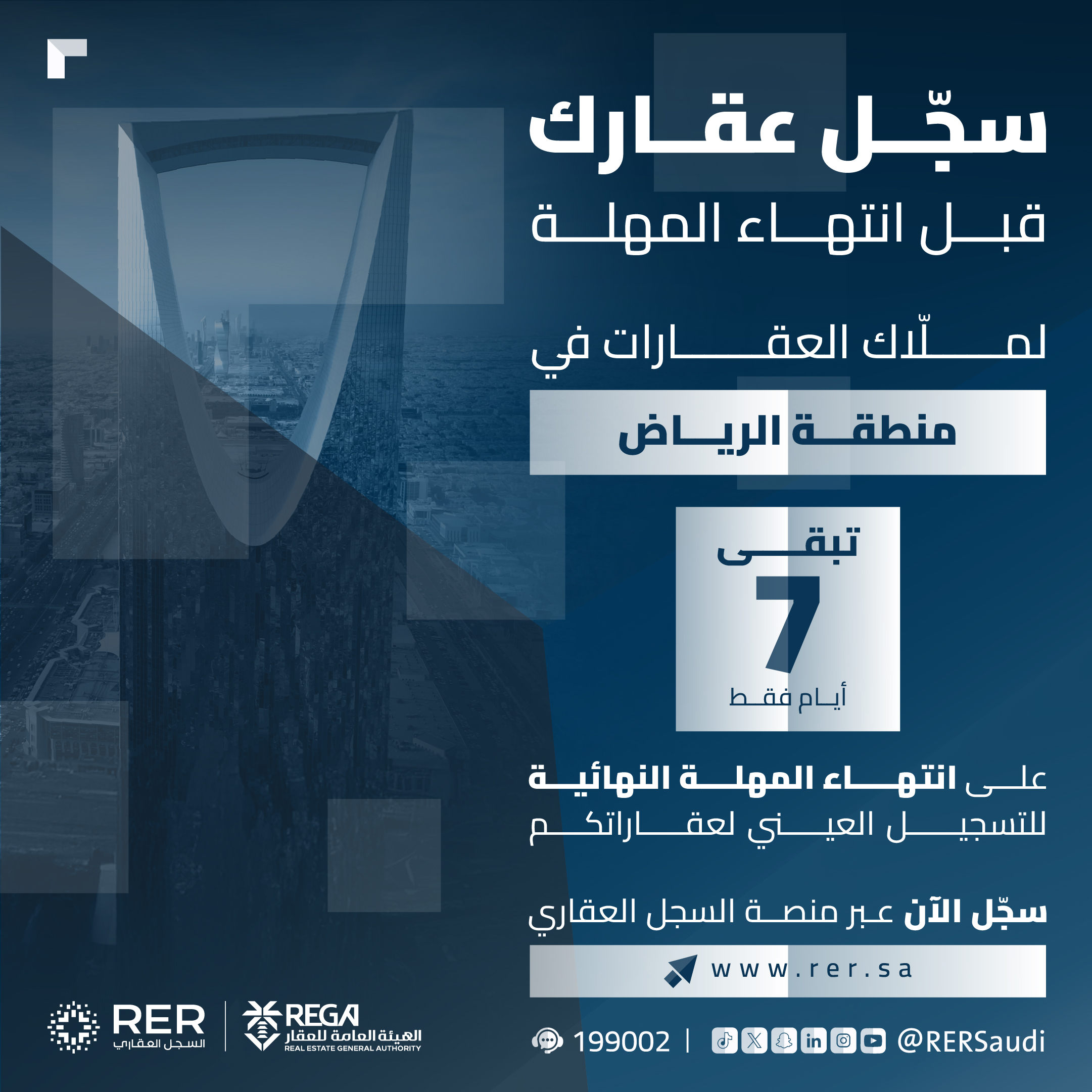 أعلنت الهيئة العامة للعقار، اليوم الثلاثاء، قرب انتهاء المُهلة النظامية الممنوحة لملّاك العقارات في المناطق العقارية المُعلنة بمنطقة الرياض، حيث يتبقى 7 أيام فقط على نهاية فترة التسجيل العيني في السجل العقاري.