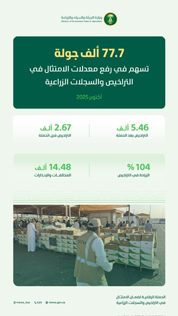 عززت وزارة البيئة والمياه والزراعة جهودها الرقابية والتنظيمية لرفع نسبة الامتثال في التراخيص والسجلات الزراعية، والتقيد بالأنظمة واللوائح، ورفع مستويات الوعي بأهمية الالتزام بتوثيق البيانات بدقة، وذلك بتنفيذ أكثر من 77.7 ألف زيارة موجهة للمنشأة خلال شهر أكتوبر الماضي، مما انعكس بشكل مباشر في زيادة عدد التراخيص إلى 5.46 ألف ترخيص، بنسبة زيادة بلغت 104%، مقارنة بـ 2.67 ألف ترخيص قبل انطلاق الحملة الرقابية الموجهة للامتثال في التراخيص والسجلات الزراعية في جميع مناطق المملكة.