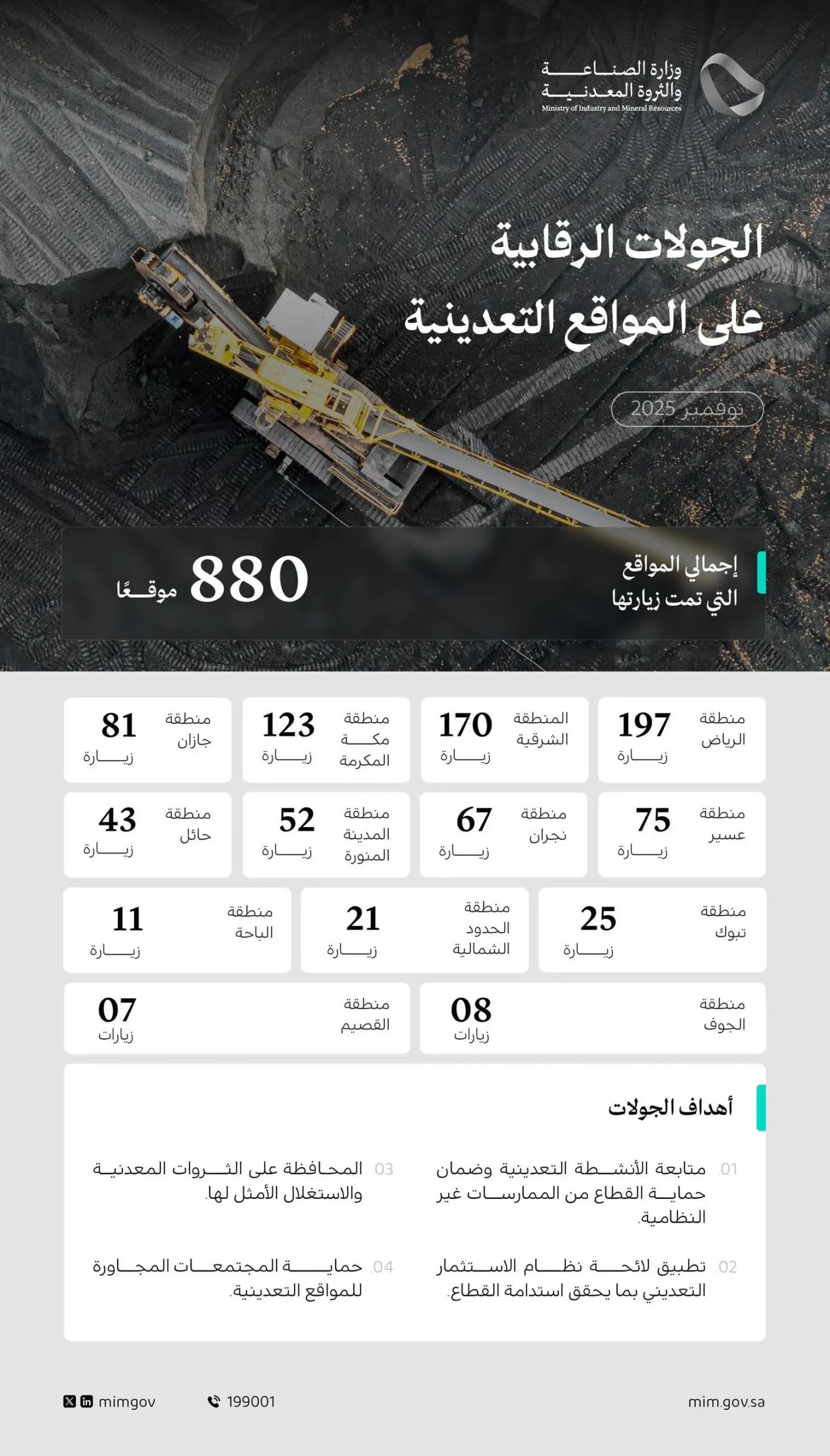 نفذت وزارة الصناعة والثروة المعدنية، ممثلة في وكالة الإشراف على العمليات التعدينية، 880 جولة رقابية على عددٍ من المواقع التعدينية، في مختلف مناطق المملكة خلال شهر نوفمبر 2025.
