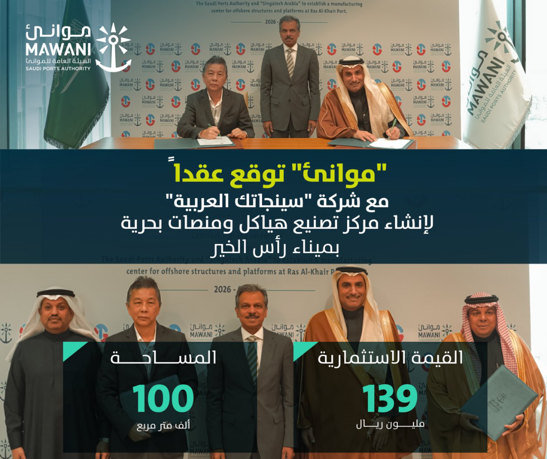 وقعت الهيئة العامة للموانئ “موانئ” عقدًا مع شركة “سينجاتك العربية”؛ لإنشاء مركز تصنيع هياكل ومنصات بحرية في ميناء رأس الخير لخدمة قطاع صناعة النفط والغاز، ويشمل ذلك إنشاء مستودعات للقطع الجاهزة، إضافة إلى توفير معدات وأنظمة لحام ورافعات متخصصة لتلبية احتياجات المشاريع البحرية من المنصات والهياكل البحرية، وذلك بقيمة استثمارية تبلغ 139 مليون ريال، وبمساحة 100 ألف متر مربع.