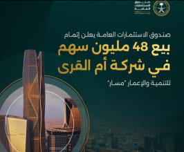 “صندوق الاستثمارات العامة” يعلن إتمام بيع 48 مليون سهم في شركة أم القرى للتنمية والإعمار “مسار”