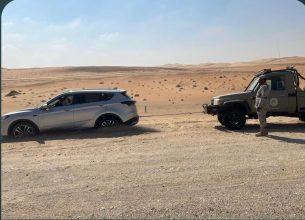 حرس الحدود يقدم المساعدة لمواطن علقت مركبته في صحراء الربع الخالي