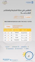 توقّع المركز الوطني للأرصاد في تقريره عن حالة الطقس اليوم -بمشيئة الله تعالى- على المشاعر المقدسة أن تصل درجة الحرارة…