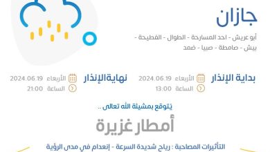 إنذار أحمر .. الأرصاد: هطول أمطار غزيرة على منطقة جازان