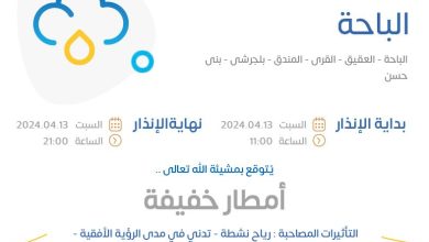 صراحة – الباحة : نبّه المركز الوطني للأرصاد من أمطار خفيفة على منطقة الباحة مصحوبة بنشاط في الرياح السطحية, على…
