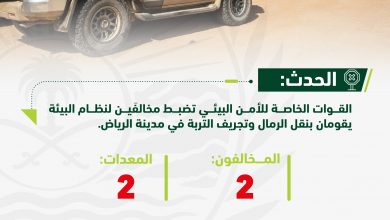 صراحة – الرياض: ضبطت القوات الخاصة للأمن البيئي مخالفَين لنظام البيئة يقومان بنقل الرمال وتجريف التربة دون تصريح في مدينة…