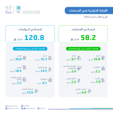 أوضحت الهيئة العامة للإحصاء أن قيمة صادرات الخدمات من المملكة العربية السعودية للربع الثالث من عام 2025م بلغت (58.2) مليار…