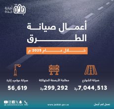 نفّذت أمانة محافظة جدة خلال عام 2025 أعمال صيانة للطرق بلغت 7 ملايين متر مربع، ضمن برامج التشغيل والصيانة المعتمدة…