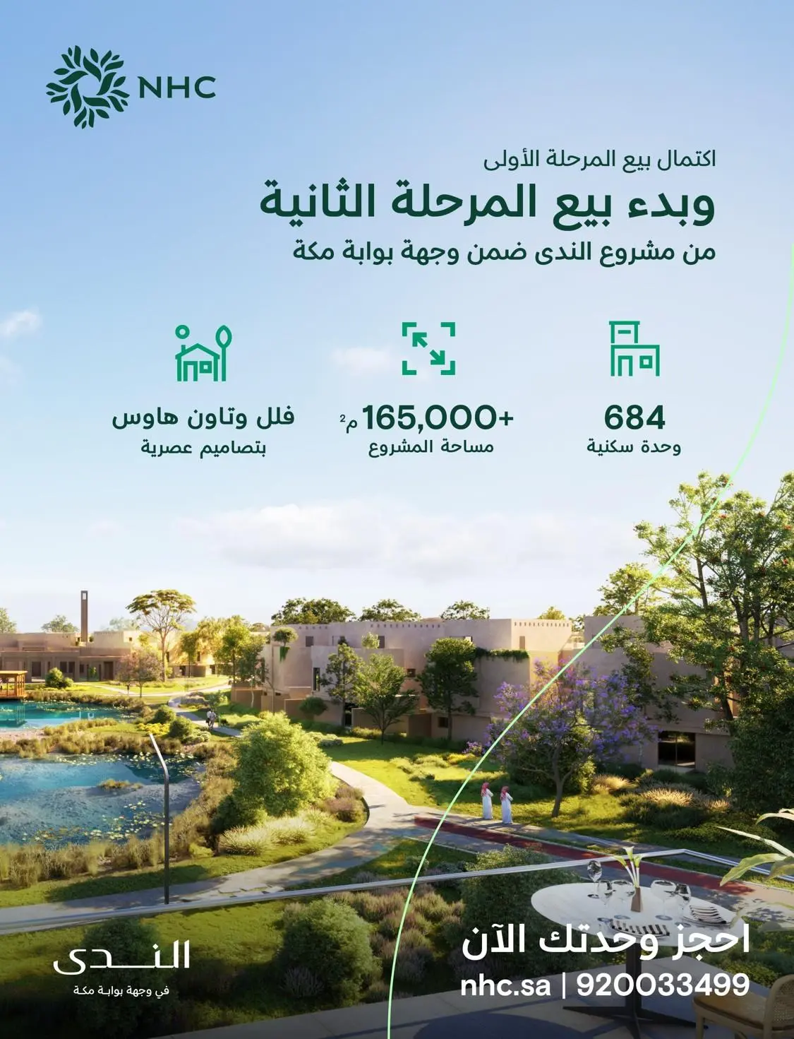 وتدعو NHC الراغبين في الحجز بالمرحلة الثانية من مشروع “الندى”، الاطلاع على التفاصيل إلى زيارة مركز المبيعات في وجهة بوابة مكة أو زيارة موقع سكني عبر الرابط التالي: