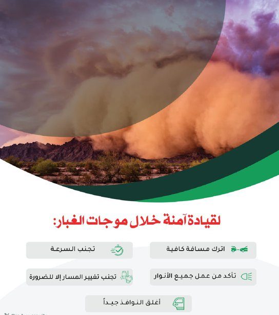 وأوضحت القوات عددًا من الإرشادات لقيادة آمنة خلال موجات الغبار، شملت ضرورة ترك مسافة كافية بين المركبات، وتجنب السرعة الزائدة، والتأكد من عمل جميع أنوار المركبة.
